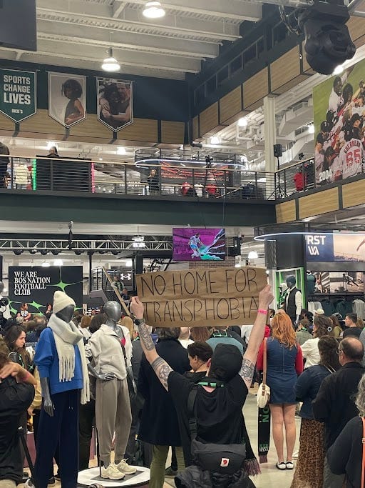 Pavlich brought a sign to the event that read “No Home For Transphobia.” They discussed why they brought the sign and what they hoped the team would do in response to the negative response the campaign has received.