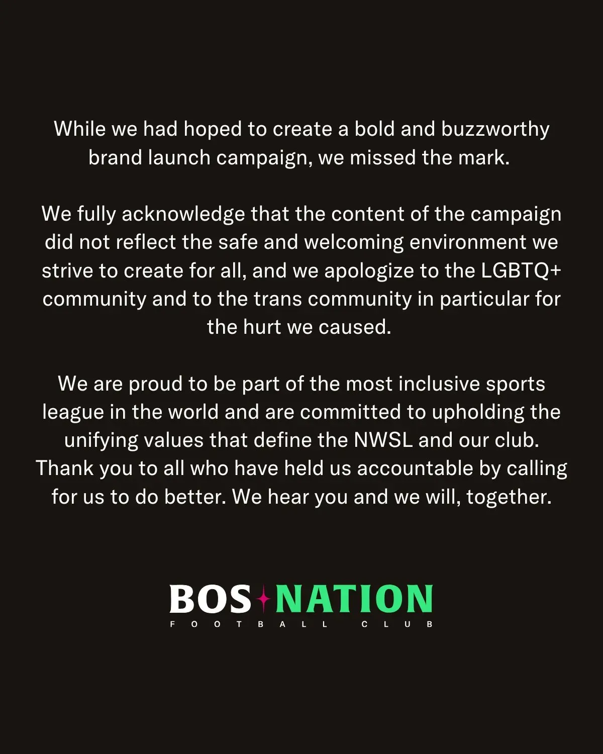 Pavlich mentioned that they hoped the team would publicly apologize — which, to BNFC’s credit, they did — but the BNFC fan also think it's important for the team to reach out to Quinn, a player for NWSL’s Seattle Reign who is openly transgender. Quinn commented on BOS Nation’s Instagram condemning the campaign. They later posted a second time, stating that their original comment had been hidden.