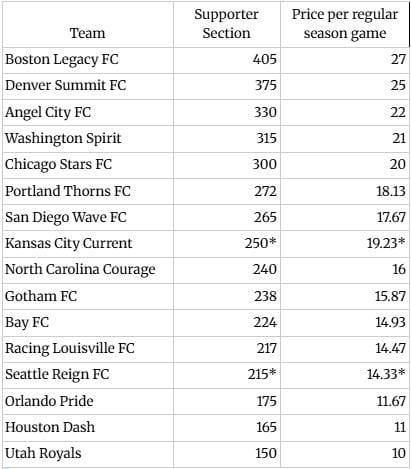 Though on the low end for Boston-area sports prices, BLFC’s memberships are among the most expensive in the National Women’s Soccer League (NWSL). Tickets in the supporter section, the cheapest tier, will cost you $405 ($27 a game) for all 15 home games. The next option jumps to $645 a season and goes up to $3,660 for premium seating.