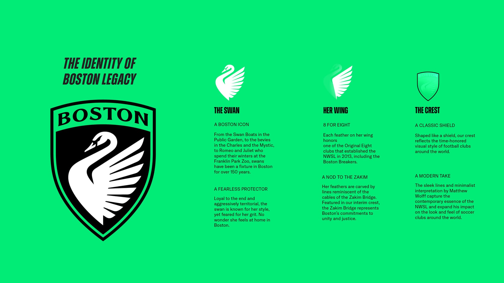 Boston Legacy FC unveiled the last puzzle piece to its brand identity today, moving on from its temporary Zakim Bridge insignia.