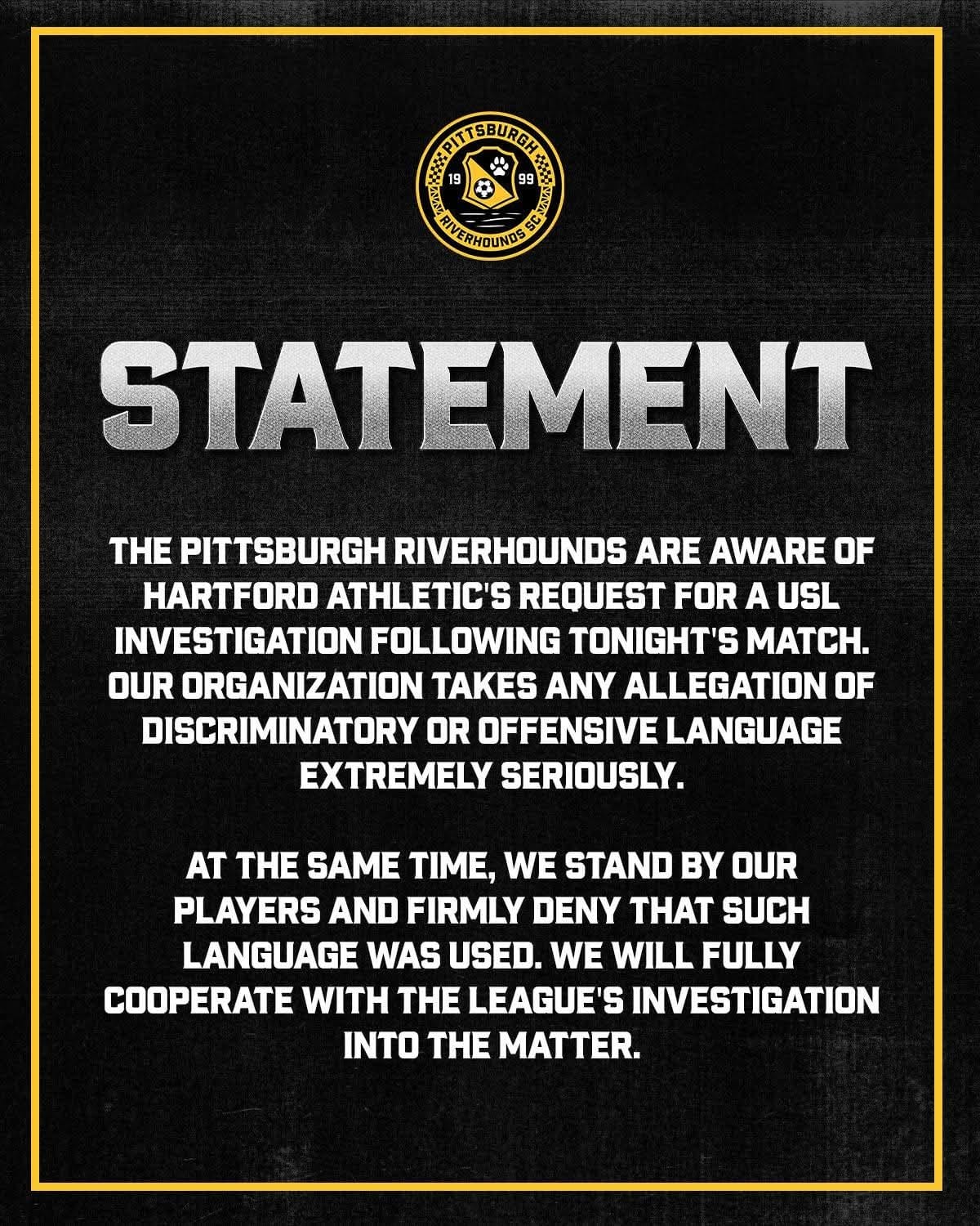 In a statement on social media, Hartford Athletic indicated that they had asked the league to investigate the use of racially offensive language by a Pittsburgh player. The language was also described as “racially abusive” and “racist,” but there was no confirmation as to the specific nature of the alleged comment, and a spokesperson for Hartford Athletic declined to provide further specifics, citing the pending league investigation.