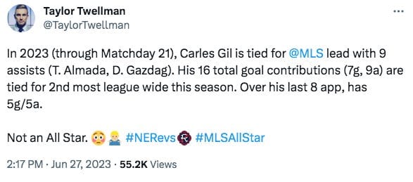 Arena isn’t the only one surprised by Gil’s snub. In fact, many people took to Twitter to express their confusion. Andrew Wiebe said he sides with Arena, Dan Roche questioned why Gil doesn’t get the respect he deserves, and Taylor Twellman provided some stats.