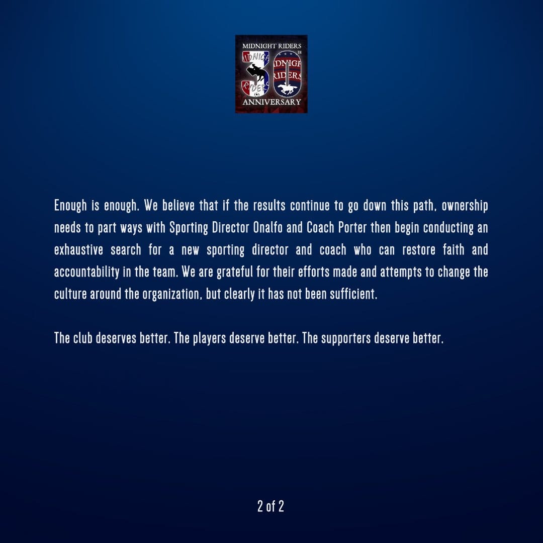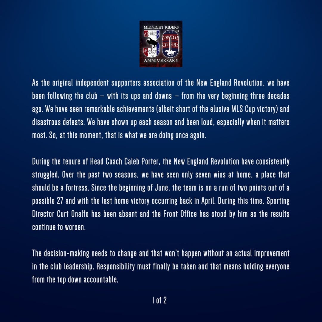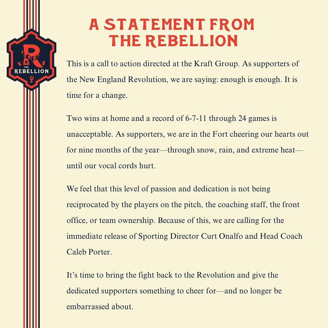 New England Revolution head coach Caleb Porter and sporting director Curt Onalfo were both asked about statements that The Rebellion and The Midnight Riders put out, asking for the duo to lose their jobs.