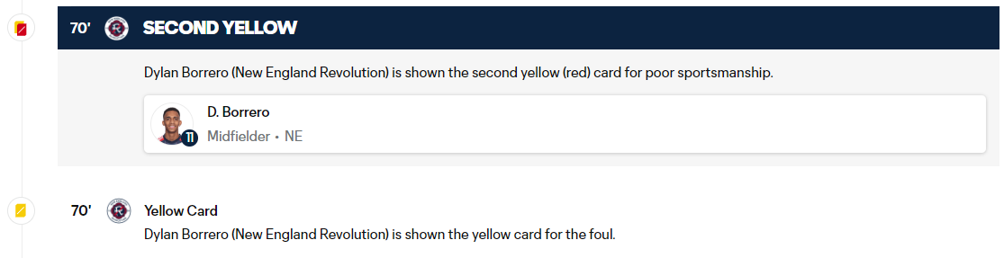 The broadcast said, “VAR has confirmed double dissent for Borrero.” Meanwhile, MLSSoccer.com states that one yellow card was “for the foul” while the second was “for poor sportsmanship.”