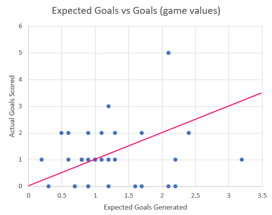 Above is a scatterplot of xG vs G, with each point on the graph coming from a single game’s xG/G. The red line is a 1:1 correspondence. Any points above the red line indicate games in which the Revolution out-performed their expected goals - i.e. got more goals than they were expected to. Values below the red line indicate the scenario Caleb Porter seems to hint at; where they generated more chances than they converted on.