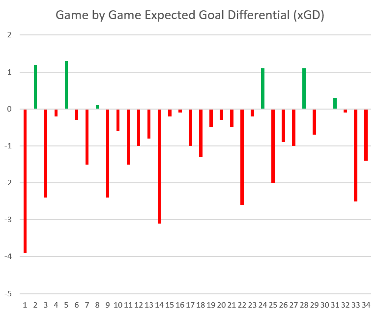 This chart shows the game-by-game expected goal differential. It will look familiar to those who read my 2024 ‘Post Mortem’. The red bars represent games in which New England’s opponents generated more chances than they were able to generate for themselves. The green bars mean the opposite.