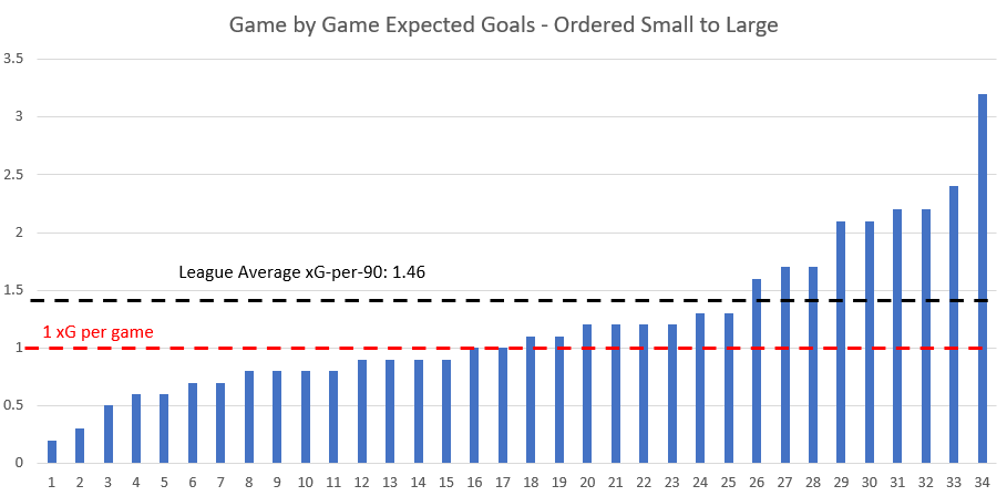 The Revs generated fewer expected goals than the league average in 25 of 34 matches. Worse than that they generated fewer than one expected goal in 15 contests on the year. They managed to create just 36.8 expected goals through the whole season, easily the worst mark in the league.