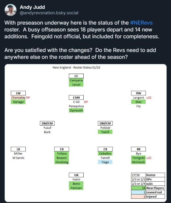 I haven’t bothered to fact check this, but I suspect that New England will be the 2nd most different team (year-over-year) of any in MLS. They narrowly lose out on the top spot to San Diego, who didn’t field a team at all last season, as they embark on their inaugural MLS campaign in 2025. Even still, I’d be willing to bet the Revs’ 32 roster transactions tops even San Diego’s transaction totals seeing as rosters are capped at 30 players.