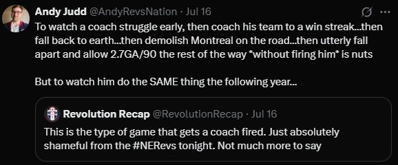 It would seem, based on recent evidence, that they’re also just 2-3 injured starters away from conceding five goals in a single half, but who’s counting? Honestly, you could make a compelling argument that Porter hasn’t actually turned the club around and that the Revs are just one head-coach away from contending in the East.