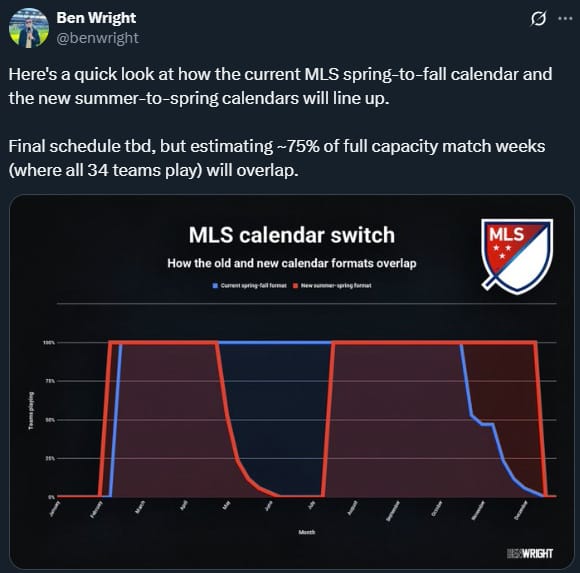 The current schedule sees the MLS regular season begin in early March (recently as early as February) and end in October. The new calendar, set to begin in 2027, would begin in July, with the regular season ending in May. This much more closely aligns with the calendars of most European (and global) leagues.