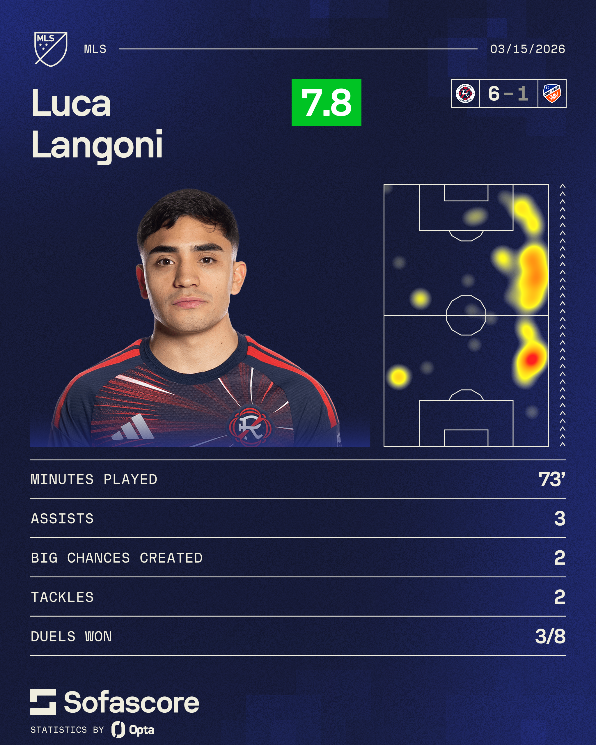 Langoni recorded a hat-trick of assists in New England's 6-1 win over FC Cincinnati. Additionally, he completed 28 of his 30 pass attempts and recorded 46 touches.