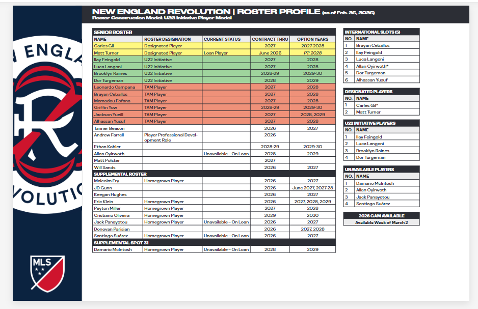 The New England Revolution are utilizing the two designated player and four U-22 player model. Matt Turner and Carles Gil are the two DP's, while Luca Langoni, Dor Turgeman, Ilay Feingold, and Brooklyn Raines are the U-22s.