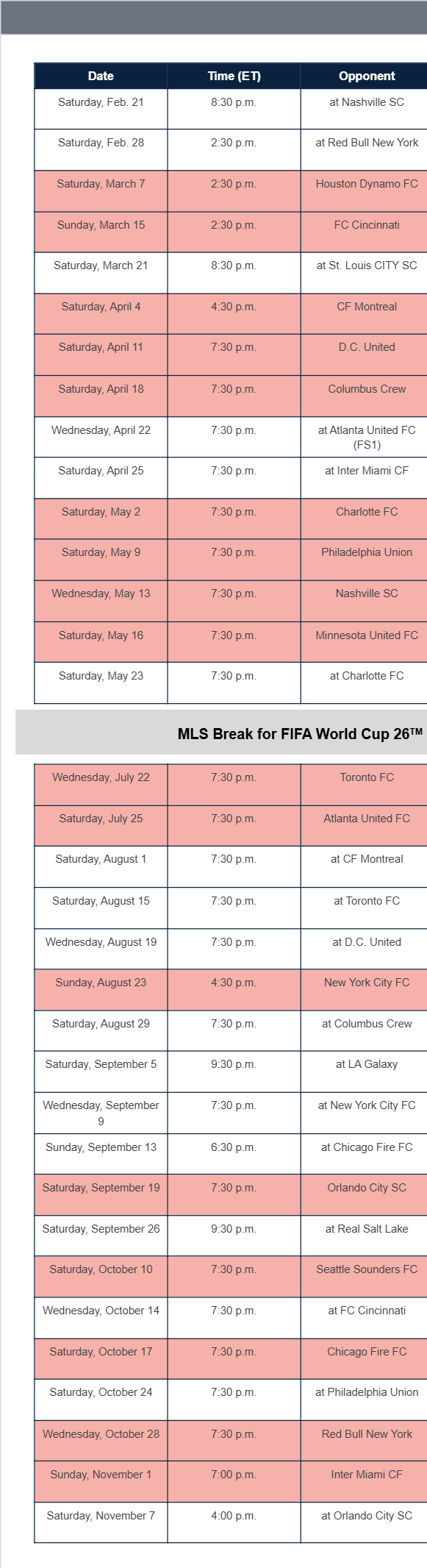 Additionally, the league will take a break for the FIFA World Cup in June. The 2026 MLS All-Star Game will take place on Wednesday, July 29 in Charlotte, N.C.