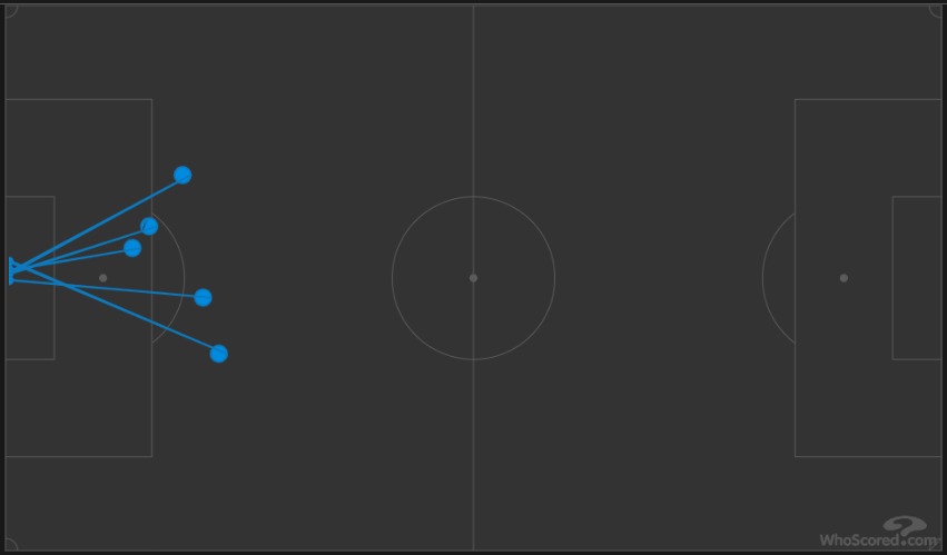 Bernardeschi’s shot chart from last week’s game, all taken from central positions and all either on target or blocked (Graphic courtesy of WhoScored.com)