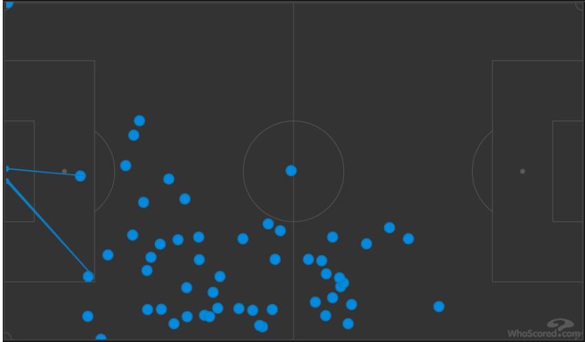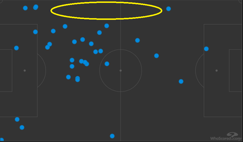 All of Insigne’s touches and two shots against Cincy last week. Insigne is most at home in the left half space (Graphic courtesy of WhoScored.com)