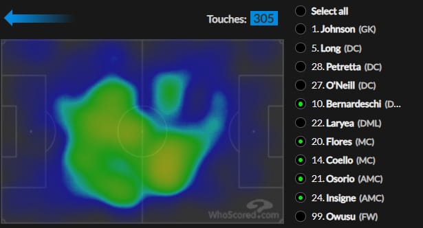 Insigne was in a perfect position, and perhaps an ideal formation overall, last week playing in on the left of the ‘2’ line behind the lone center forward, Prince Owusu. That half space position is where Insigne spends most of his time operating and leaves him well supported with a target player in front of him, two covering center mids behind him and a left wing back creating width to one side.