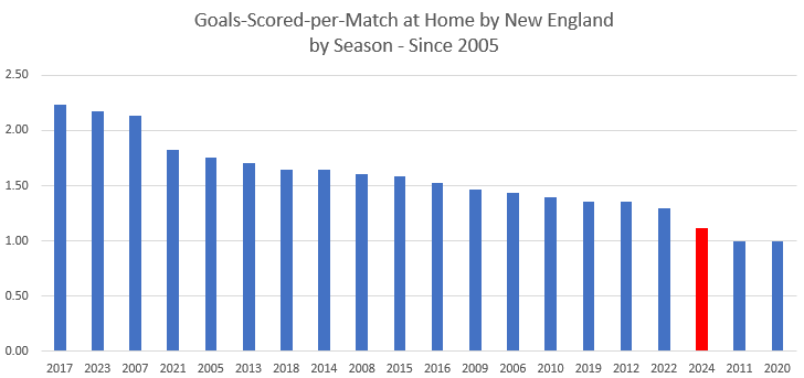 The 2024 season stands fairly far apart from the pack with a whopping 1.76 goals-allowed-per-home-contest. The next closest was 2011 at 1.41 and 2007 at 1.40.