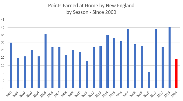 2000 was the first season that MLS allowed for games to end in a draw, so lets begin there. Only twice have the New England Revolution earned fewer points at home than in 2024, in 2011, and in a Covid-shortened 2020 season.
