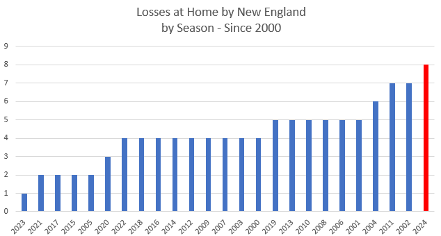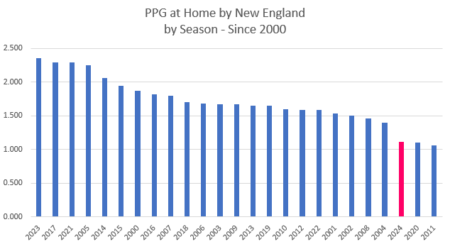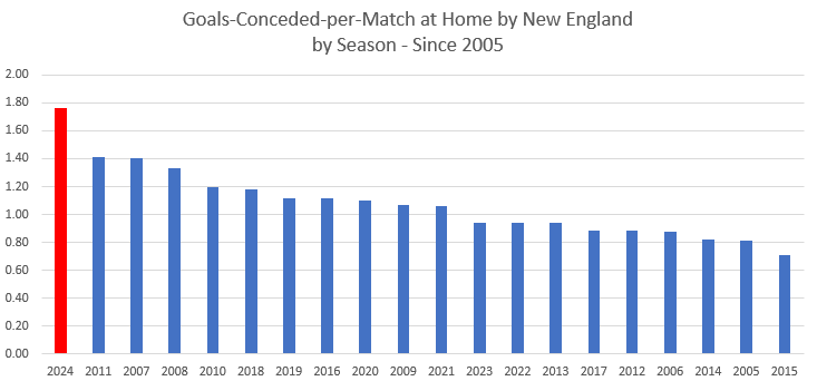 Before this season, the average goals-allowed at home for New England was 1.04. They surpassed that average by 69% this year.
