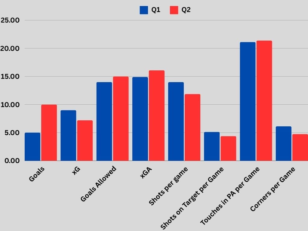 Despite the increase of goals scored the underlying statistics for goal scoring; shots, shots on target, corners, and expected goals all decreased in Q2 compared to Q1. Touches inside the penalty area were essentially flat quarter to quarter, though they had been trending down until the last game of Q2.