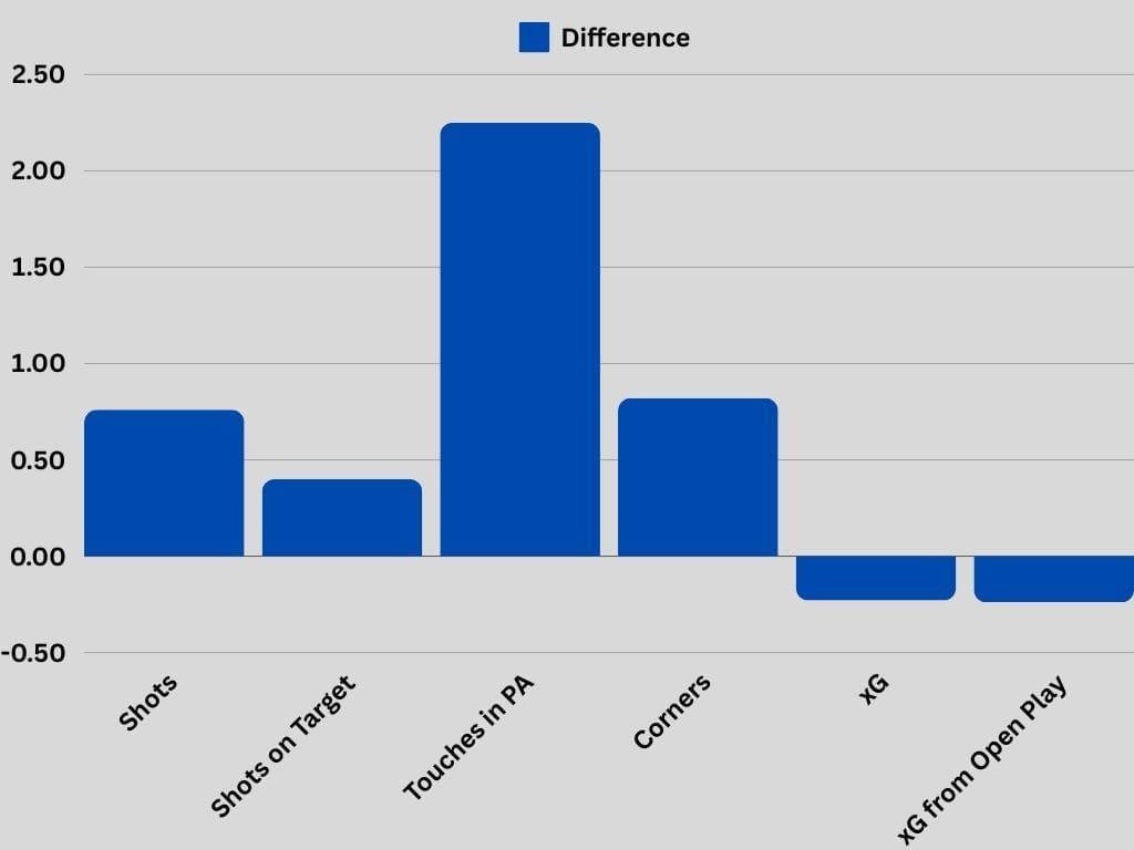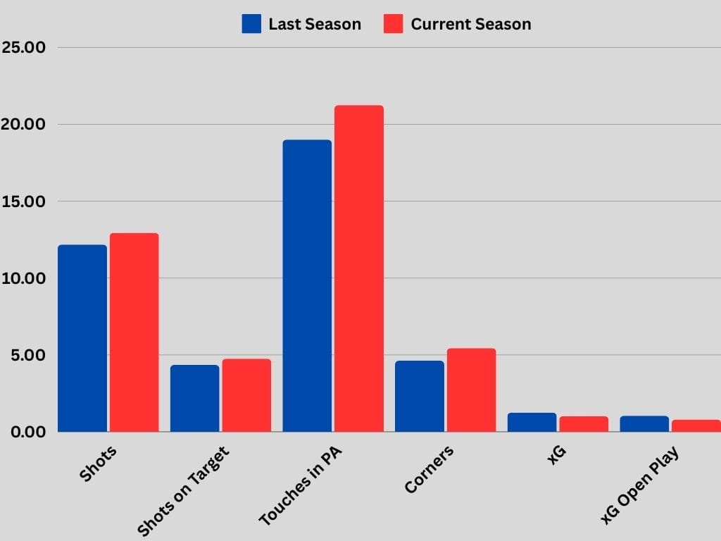 After 16 games in 2024, New England is outperforming 2023 in terms of shots, shots on target, corners, and touches in the penalty area on a per-game basis. That has not led to an increase in either expected goals or xG from open play in 2024 from 2023, the Revs are underperforming on both so far this season.