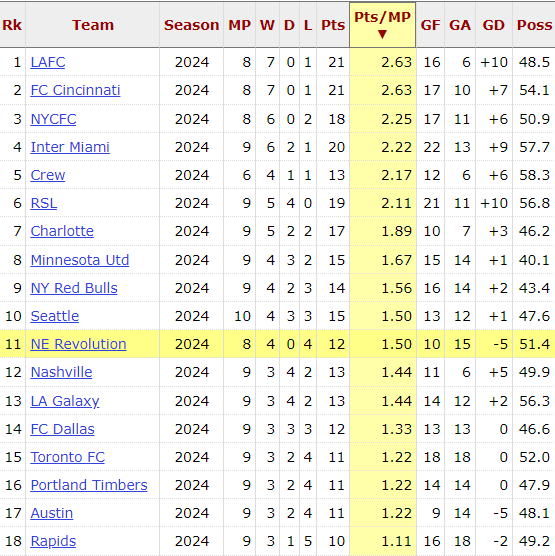 The Revs were 11th in MLS in points per game during the period of their eight games in second quarter. It should be noted that not all teams played an equal number of games. The top 18 teams in the period from April 26 to June 16 are shown below, 18 representing the number of MLS teams making the playoffs.