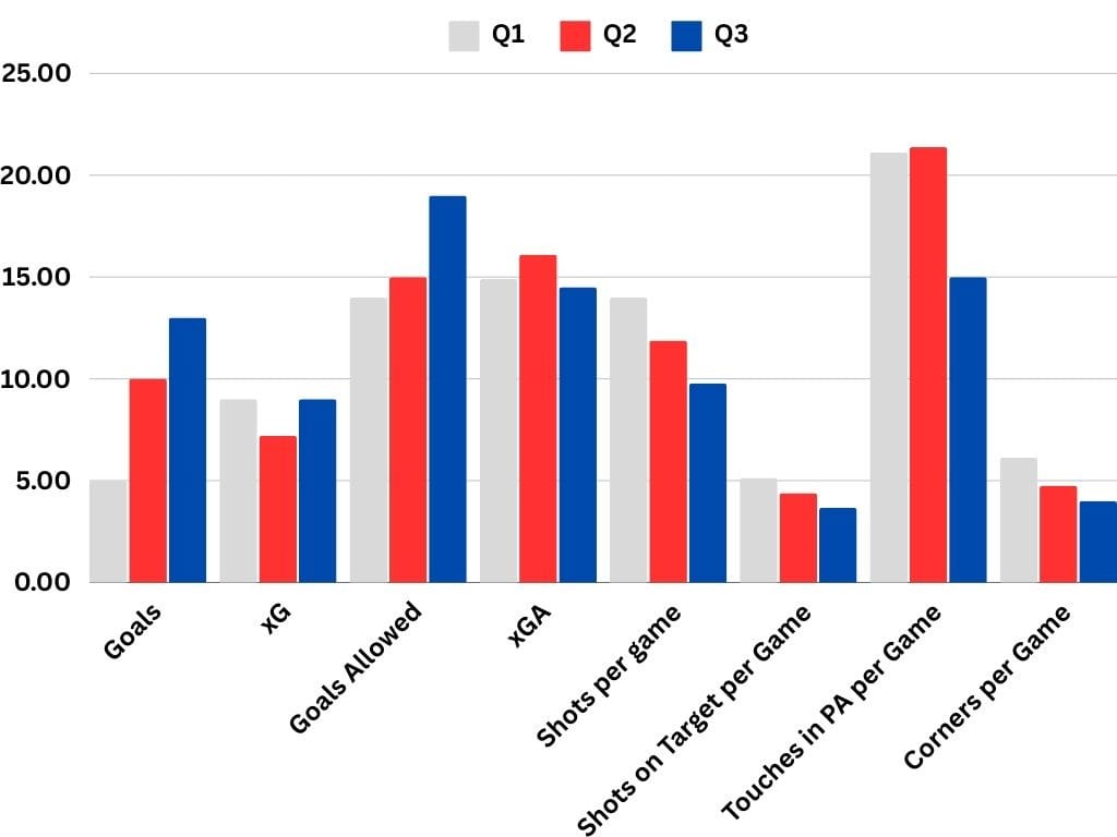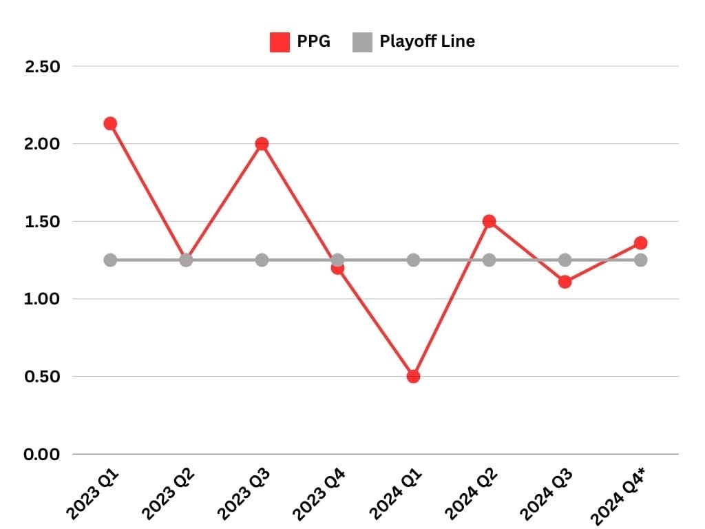 The Revs were below the 1.25 points per game playoff line target in Q3 for the second quarter this season and declined from Q2’s 1.5 points per game pace.