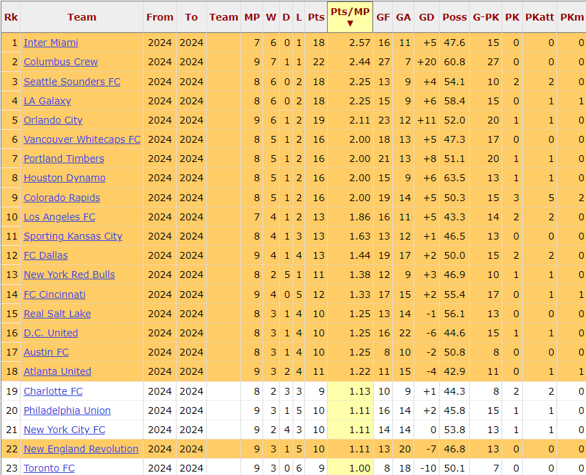 The results were a 44.5% year-over-year decrease from the second quarter of 2023 when the team achieved 2 points per game. Despite the disappointing results, the Revs still sit within striking distance of the playoffs as they are currently five points off ninth place but with two games in hand against all competing teams.