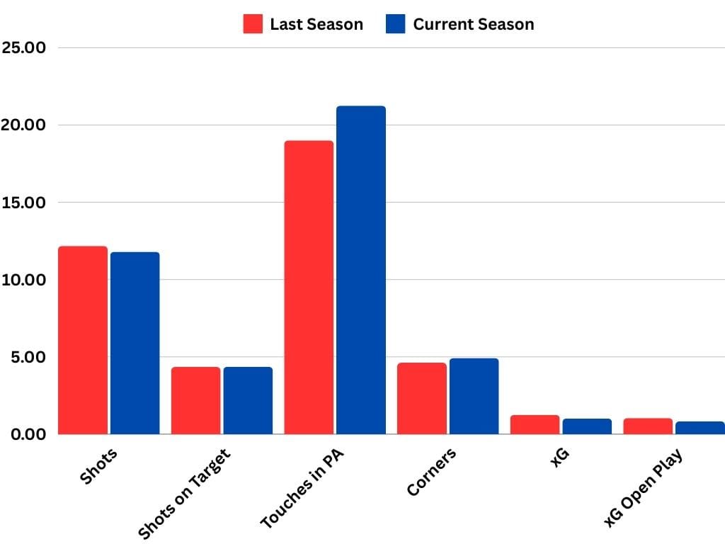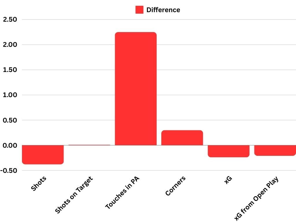 After 25 games in 2024, New England is outperforming 2023 in terms of corners and touches in the penalty area on a per-game basis, while being essentially flat in shots on target and down on shots overall. That has led to a decrease in both expected goals and xG from open play in 2024 from 2023, the Revs are underperforming on both so far this season.