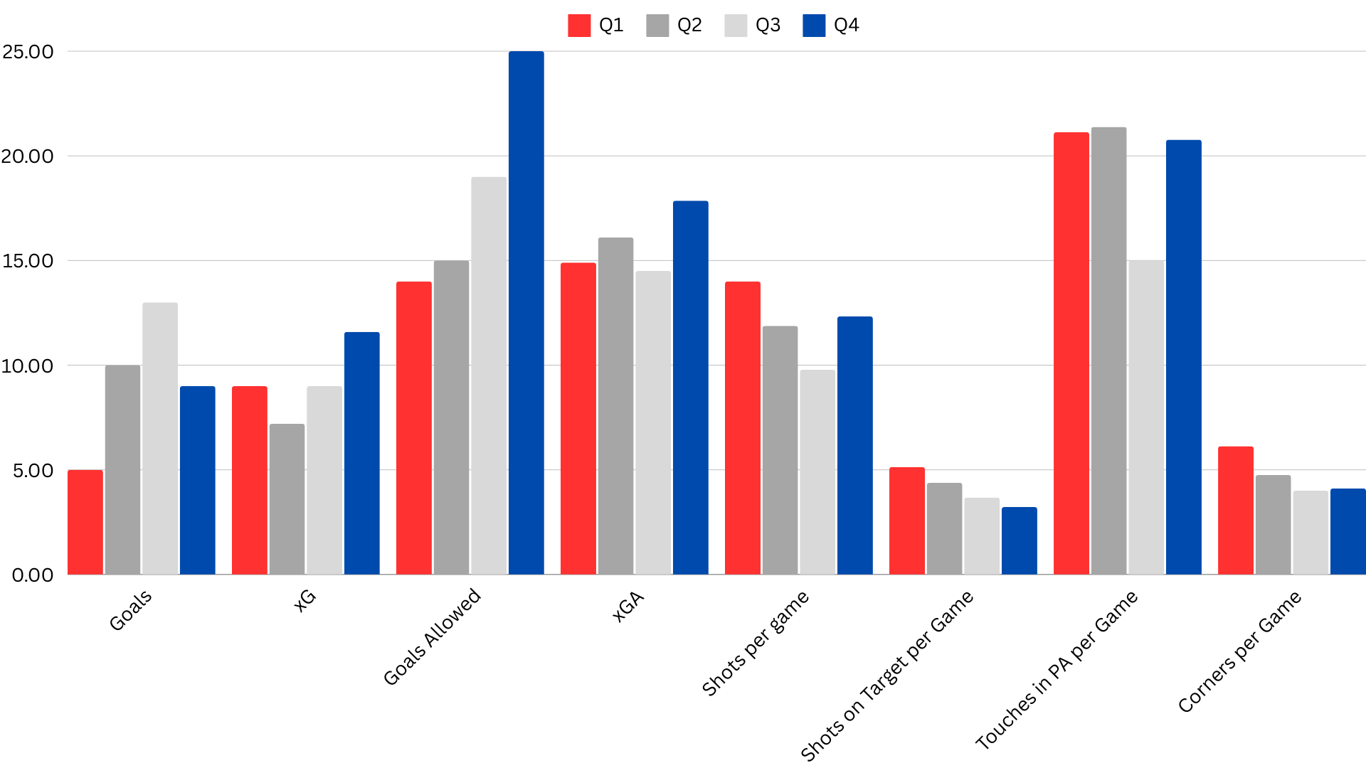 Defensively, the team saw an uptick of goals allowed per game to 2.77, 25 in total across nine games. This was in comparison to 1.92 goals allowed, 48 in total, in the season’s first 25 games. This increase in goals allowed was matched by the highest xG allowed per game quarterly total of 17.86 in the fourth quarter, a noticeable increase over Q3’s season-best 14.5 xG allowed across a similar number of games.