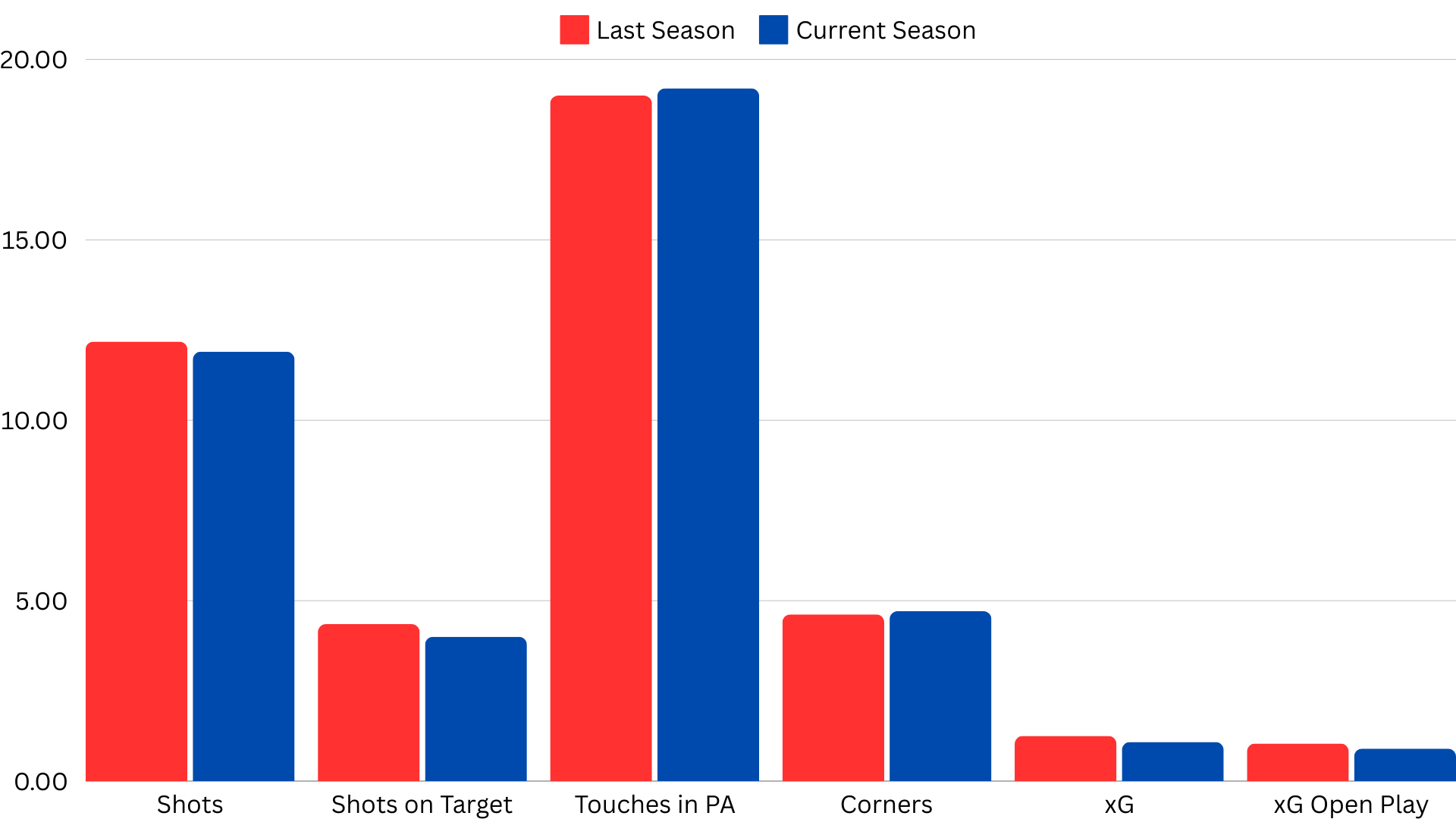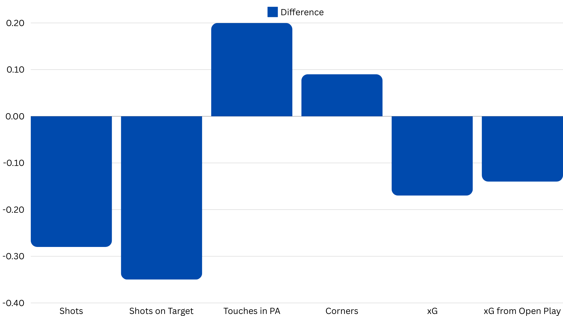 With the 2024 season complete, the Revs finished with minimal increases in corners and touches in the opponent’s penalty area per game when compared to 2023. More concerning and significant were the Revs declines in shots, shots on target, expected goals, and xG from open play per game compared to 2023.