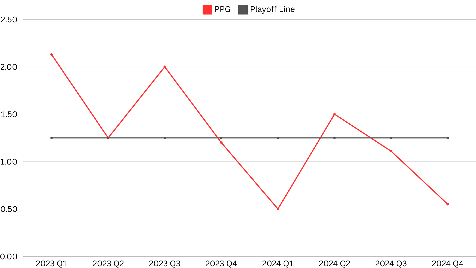 The abysmal points total in the fourth quarter nearly matched the .5 points per game rate in the disastrous 2024 first quarter. This final period of the season did not have the same mitigating circumstances as the opening quarter of the season and must be looked at as a complete failure. The team could not even keep pace with its meager 1.30 points per game rate in the middle half of the season.