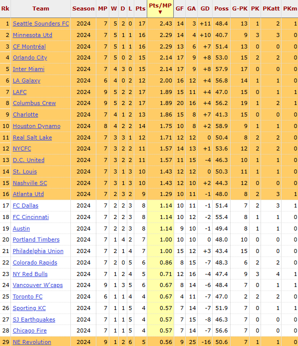 The Revs were last in MLS in points per game during the period of their nine games in the fourth quarter. It should be noted that not all teams played an equal number of games. The top 18 teams in the period from September 7 to October 19 are highlighted below, as are the Revs, 18 representing the number of MLS teams making the playoffs.