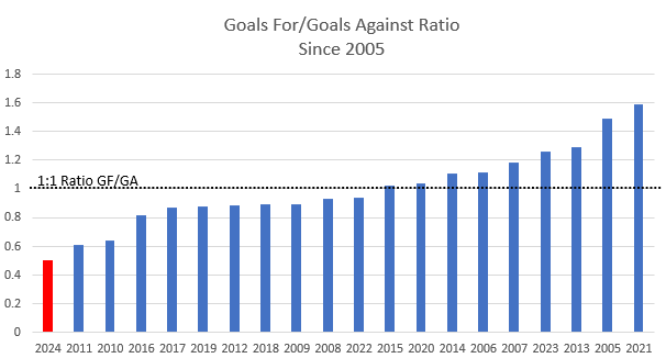 Instead, they set records in the opposite direction, conceding the most goals in club history and setting a new low benchmark for GF/GA ratio.