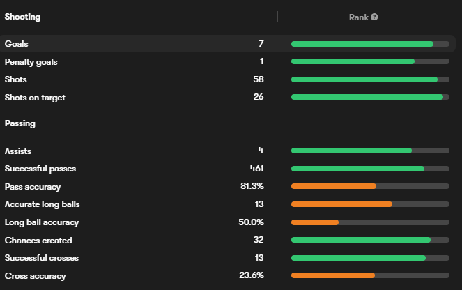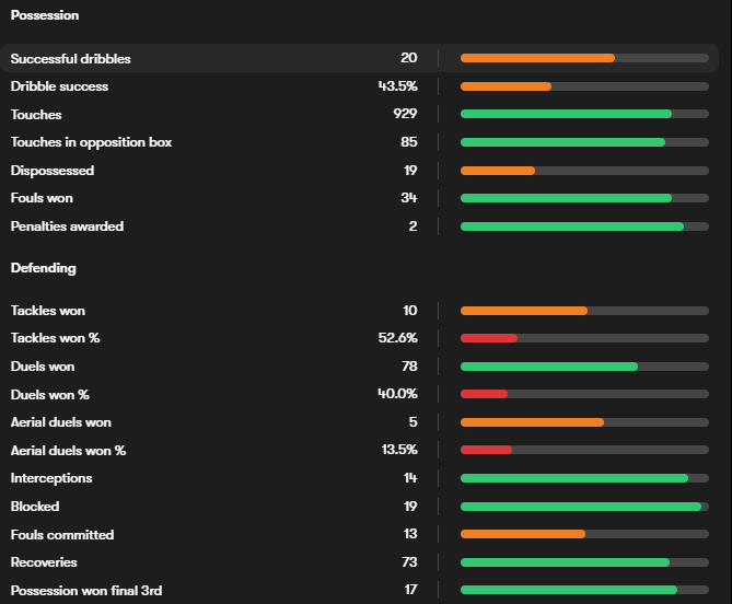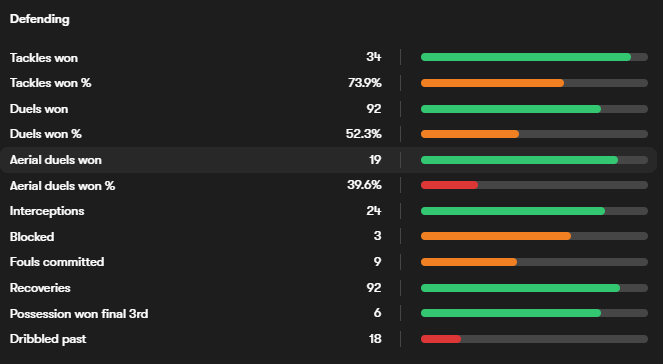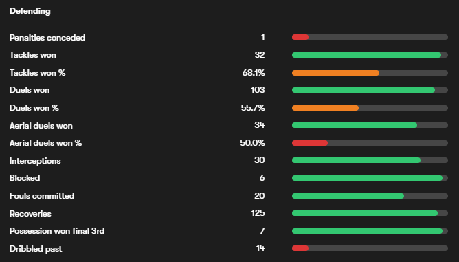 We saw above how he ranks in passing and possession. His defense is just as good as he finds himself ranked high in tackles won (92.5%), duels won (79.2%), aerial duels won (86.6%), interceptions (81.1%), recoveries (87.7%), and possession won in the final third (79.2%).