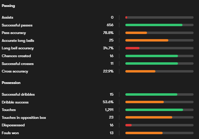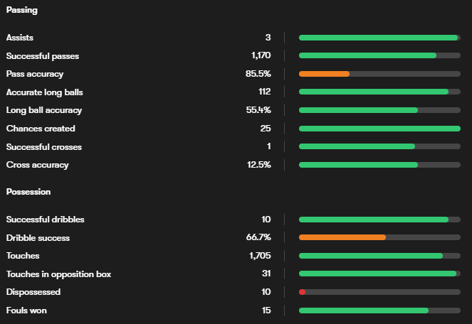Like McIntosh and Monis, Klein found himself highly ranked in stats like assists (98.3%), successful passes (85.1%), accurate long balls (92.6%), chances created (100%), cross accuracy (73.6%), successful dribbles (92.6%), touches (89.3%), touches in the opposition box (97.5%), and fouls won (80.2%).