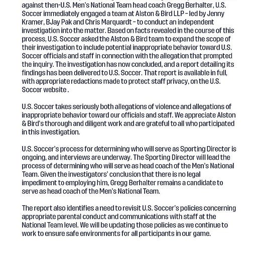 That is not to excuse the conduct of Gregg Berhalter in particular over 30 years ago in that a very clear domestic violence incident that occurred between himself and his now wife Rosalind while they were in college. The Berhalters have been very open to investigators regarding what occurred that night and how the couple moved on and Gregg in particular grew from that experience and worked hard at rebuilding his relationship. These details should have remained private to the Berhalter family and the only reason they came to light is deplorable.