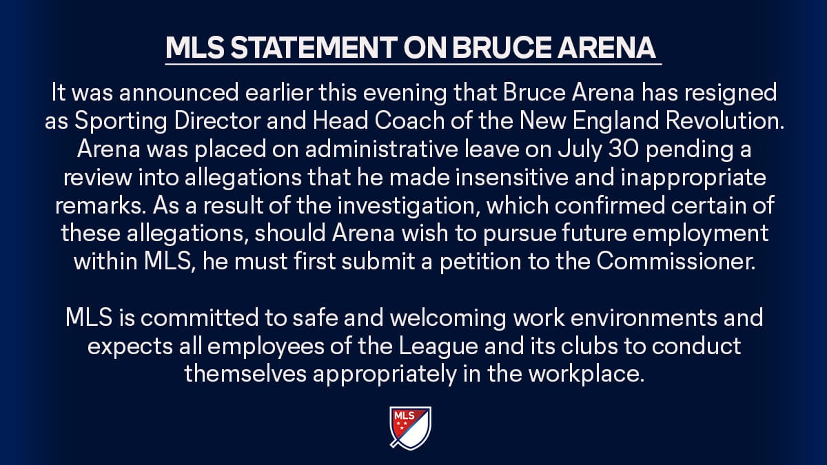 UPDATE: Bruce Arena issued a statement confirming that he has resigned from the New England Revolution.