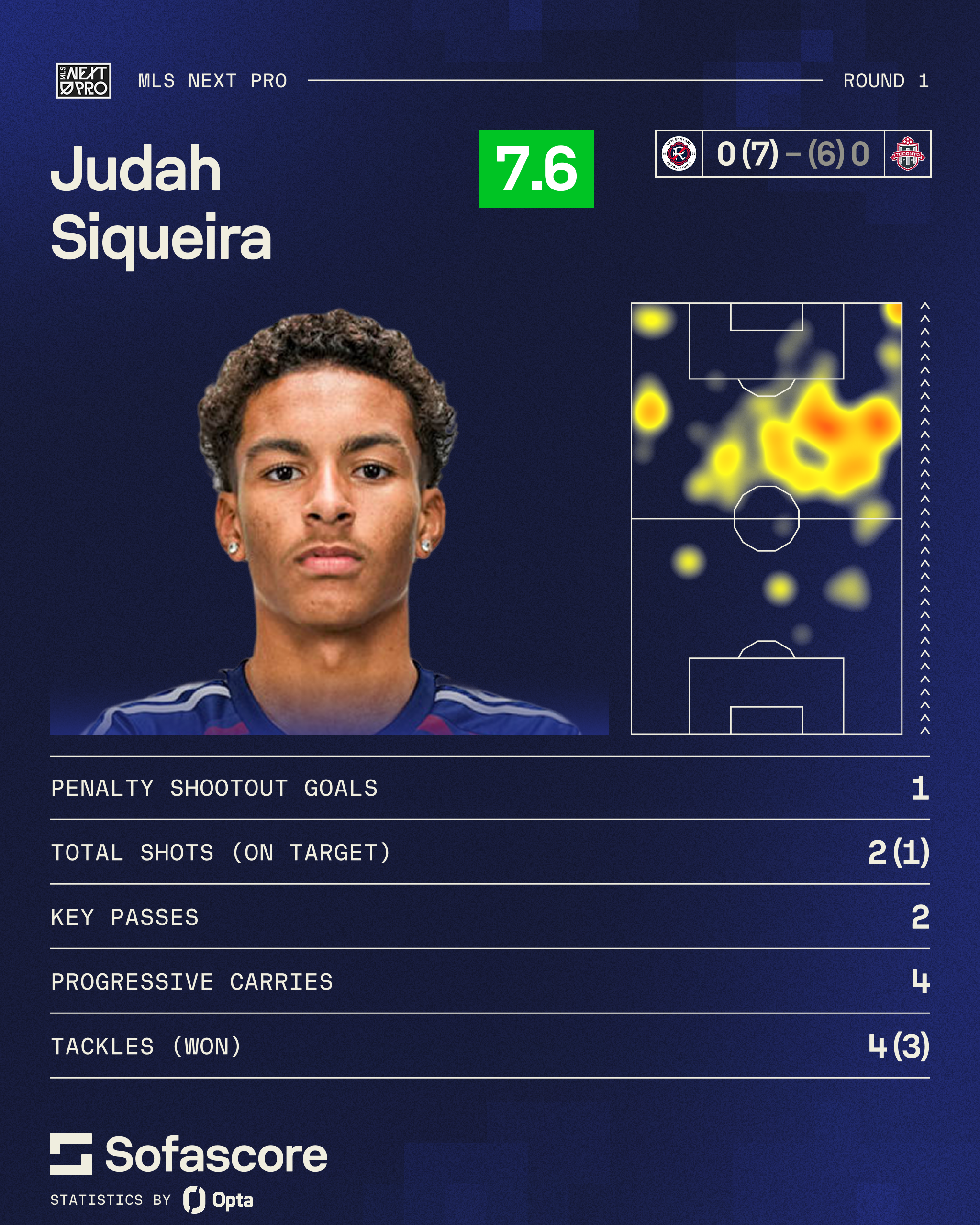 The 16-year-old ended his first start of 2026 with two key passes, two of four accurate crosses, completed 34 of 41 passes, two of three accurate long balls, completed four defensive actions, and capped off the night by converting in the shootout to help secure a 7-6 shootout victory.