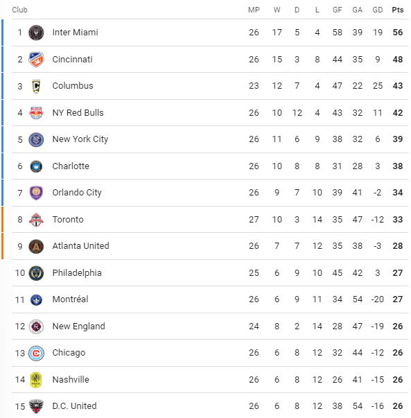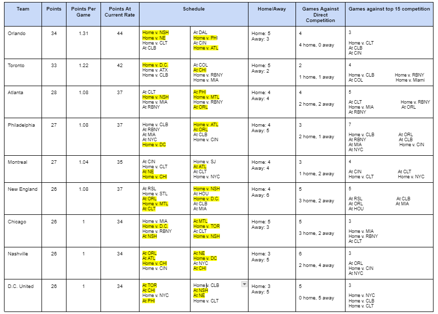 - It looks certain that Orlando will make the playoffs as they currently hold the 7th spot and are averaging 1.31 points per game. Toronto has three straight home games (D.C., Austin, and Columbus). Can they pull away from the pack? Atlanta will be looking to do the same when they travel to Charlotte before hosting Nashville.