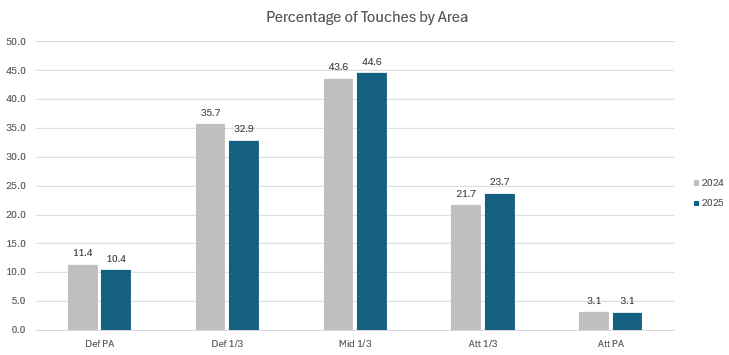 In fact, in both 2024 and 2025 (thus far) New England is taking 3.1 percent of touches in the attacking PA. That was good for third lowest in 2024, but is currently more middle-of-the-pack (at 10th lowest) in 2025.