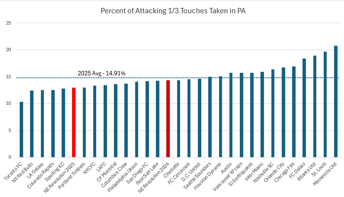 The above chart shows the percentage of attacking 1/3 touches that take place within the penalty area. The Revs 12.97% is sixth from the bottom. I’ve shown their 2024 percentage (14.35%) as well, as a reference.