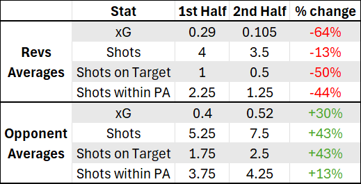 New England’s second half performances have yielded an average of 0.105 xG. They average 0.5 shots-on-target in 2nd halves so far. Yes, you read that correctly. 0.5 shots-on-target.