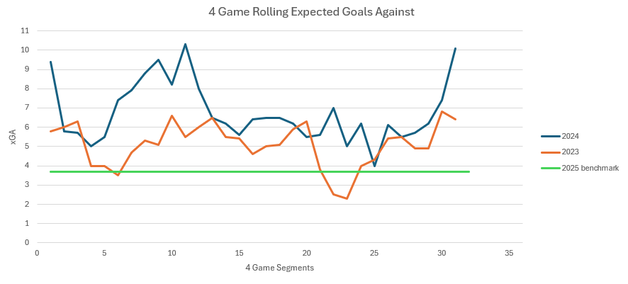 In fact, in order to find a four-game stretch with a lower xGA, you’d have to go all the way back to September 2nd, 2023.