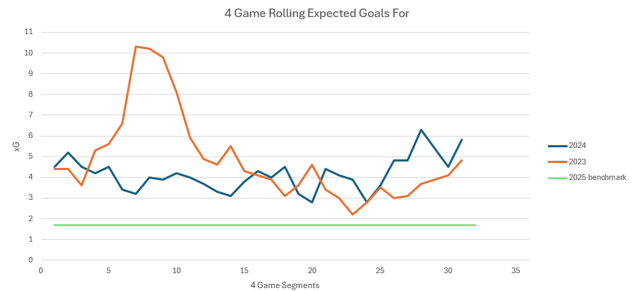 Here’s a similar plot to the xGA chart above, except this time it shows 2023 and 2024 expected-goals-FOR on a 4 game rolling basis (with this year’s performance benchmark, again, in green).