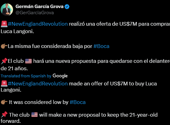 According to Merlo, the Revs reportedly began negotiations with Argentine Primera División side Boca Juniors over a potential deal for winger Luca Langoni.