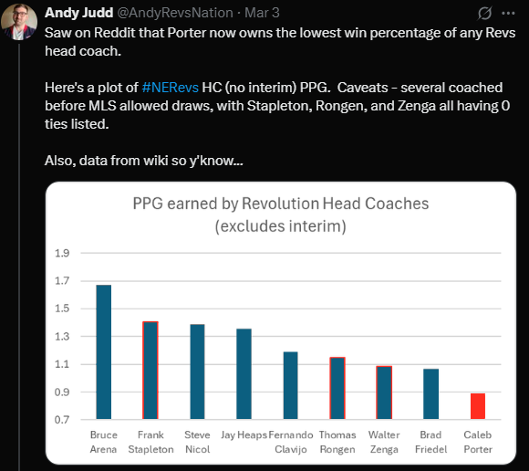 The season starts with a draw and three losses. Rumors begin flying that a late March match against NYRB is considered “must win” for Porter to retain his job. The Revs earn a PK in the 90+8’ and “do win”.