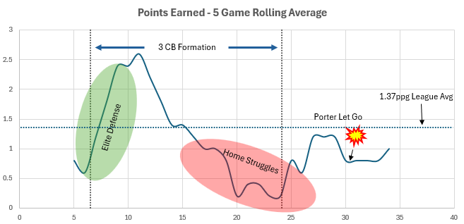 This represents a rolling 5-game average in terms of points per game. The league average was 1.37 ppg earned. The Revs did have a good stretch of about 6 weeks where they averaged above that mark.