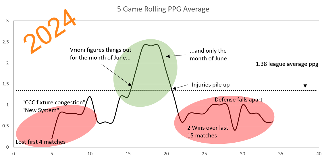 A 9-match undefeated streak (5W 4D 0L) in April/May was immediately followed by a 9-match winless run (0W 2D 7L) in June/July. After that it seemed the writing was on the wall for Caleb Porter, who was let go on September 15.